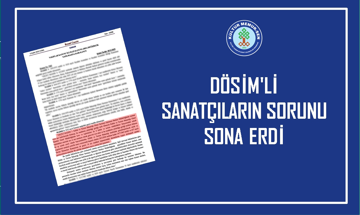 Kültür Memur Sen olarak; toplu sözleşmelerde, kurum idare kurulu, KPDK toplantılarında, Bakan ve üst düzey yönetici ziyaretlerinde gündeme taşıdığımız her platformda sorunun çözülmesi için mücadele verdiğimiz DÖSİM’li sanatçılar sorunu sona erdi. TBMM yasalaşarak bugün yürürlüğe giren yasayla Güzel Sanatlar Genel Müdürlüğü’nün yapacağı sınav sonucu sanatçı kadrolarına kavuşacaklar.
